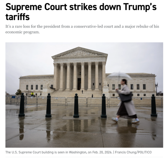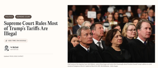 当地时间2月20日,美国最高法院作出“里程碑”式判决:以6比3的多数意见,裁定特朗普政府依靠“国际紧急经济权力法”(IEEPA)征收的一揽子全球关税缺乏法律依据,大部分关税自一开始就“无权征收”,因此无效。