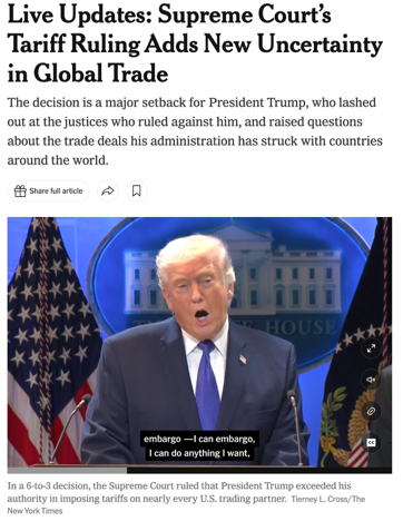 在美国国内,特朗普政府一直用“关税政策”来包装自己的经济路线,宣称“别国要想卖东西到美国,就必须付出代价”,把关税说成既是谈判大棒,也是增加财政收入、保护就业的万能工具。依靠IEEPA,美国在过去一年尝试推动的,是一种几乎覆盖所有贸易伙伴的“全球关税架构”,目标是“全面重写美国对外贸易规则”。但是现在,最高法院明确表示:这条路行不通,至少不能靠“紧急状态”这条捷径。相应地,这给特朗普政府的经济议程带来了不小冲击。